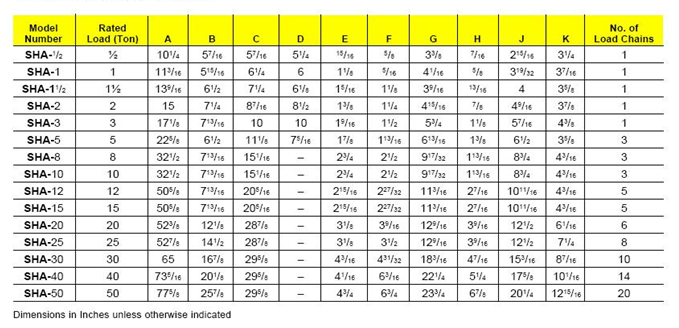 - 額定載荷為 1/2 - 50 噸,并配有5,10,15和20英尺的起升高度。標(biāo)準(zhǔn)手拉鏈長度小于提升高度 2 英尺。