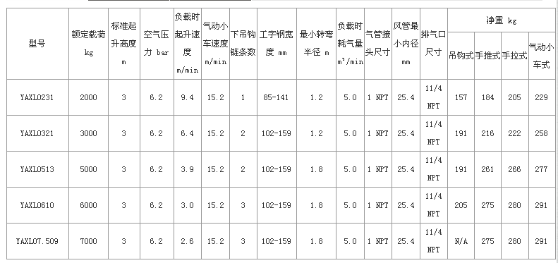 Lodestar XL 型耶魯氣動(dòng)環(huán)鏈葫蘆:耶魯氣動(dòng)環(huán)鏈葫蘆系列是您物料搬運(yùn)的理想選擇,可應(yīng)用于電動(dòng)葫蘆無法操作的環(huán)境。耶魯氣動(dòng)環(huán)鏈葫蘆系列可提供多種控制速度,比電動(dòng)葫蘆更加節(jié)約成本。耶魯氣動(dòng)環(huán)鏈葫蘆系列具有以下優(yōu)勢(shì): 精細(xì)定位 - 重物的上下速度可在零至最大值之間連續(xù)變量。 可在極高溫度下操作 - 可在高溫下操作而無需額外保護(hù)。 提供更高的速度需求 - 對(duì)于速度要求十分苛刻的應(yīng)用,耶魯氣動(dòng)環(huán)鏈葫蘆系列可提供更高的速度。 遠(yuǎn)離電擊危險(xiǎn) - 氣壓是氣動(dòng)葫蘆的動(dòng)力來源,因此較之電動(dòng)葫蘆具有遠(yuǎn)離電擊的顯著優(yōu)勢(shì)。 防火花選項(xiàng) - 可應(yīng)用在有可燃物質(zhì)存在的使用環(huán)境。 易于維護(hù) - 較之電動(dòng)葫蘆沒有接觸器,變壓器,馬達(dá)組件,保險(xiǎn)絲等需要更換配件。只要提供優(yōu)質(zhì)氣源并潤(rùn)滑,耶魯氣動(dòng)環(huán)鏈葫蘆系列是非常易于維護(hù)。 產(chǎn)品特性 Lodestar XL 型耶魯氣動(dòng)環(huán)鏈葫蘆的額定載荷最高為7.5噸,具有高工作級(jí)別和無級(jí)變速來精確定位,是不能提供電源的危險(xiǎn)環(huán)境的理想選擇。 可在90 PSI 氣壓下每分鐘運(yùn)行9至31英尺。 采用控制手柄操作,可精細(xì)定位。 配有吊鉤或吊柄懸掛方式。吊柄懸掛方式可與手推/手拉小車或氣動(dòng)小車搭配使用。 由 6 葉片組成氣動(dòng)馬達(dá)具有高所知或平穩(wěn)操作。 采用短管閥啟動(dòng)更平穩(wěn)。 氣動(dòng)馬達(dá)制動(dòng)裝置可有效控制重物。 采用精細(xì)鍛壓鋼的齒輪傳動(dòng)機(jī)構(gòu)經(jīng)油浸潤(rùn)滑,可更加長(zhǎng)久和安靜的操作。 采用10 窩輪的起升鏈輪,可更加平穩(wěn)操作并減少鏈條磨損。 具有過載保護(hù)裝置,防止葫蘆,操作者等由于過載操作而受到損傷。 可選防火花選項(xiàng) - 可提供鍍銅吊鉤,不銹鋼安全搭扣和鍍質(zhì)起重鏈條。