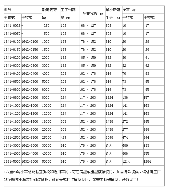 - 車輪一邊采用重型鋼制側板,具有更高強度及硬度,對車輪提供額外保護。0.25 -12 噸小車采用通用型胎面適用于平直或錐形橫梁。16 -25 噸小車適用于錐形美國標準橫梁。如有特殊橫梁需求,請咨詢工廠。